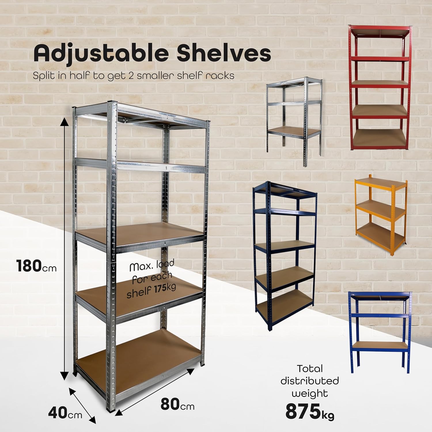 • 𝟱 𝗧𝗜𝗘𝗥 𝗦𝗧𝗢𝗥𝗔𝗚𝗘 𝗥𝗔𝗖𝗞 — The dimensions of the shelf are 40 x 80 x 180 cm and the load capacity is 875 kg. The shelf can be used in your garage, warehouse, basement or utility room to organise all your tools and equipment. Heavy duty garage shelving; storage shelf unit; storage shelves for garage; storage racks; narrow shelving.