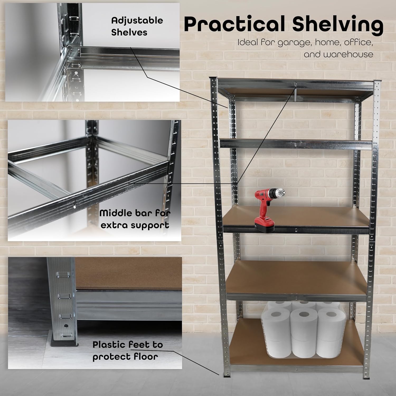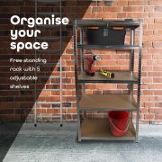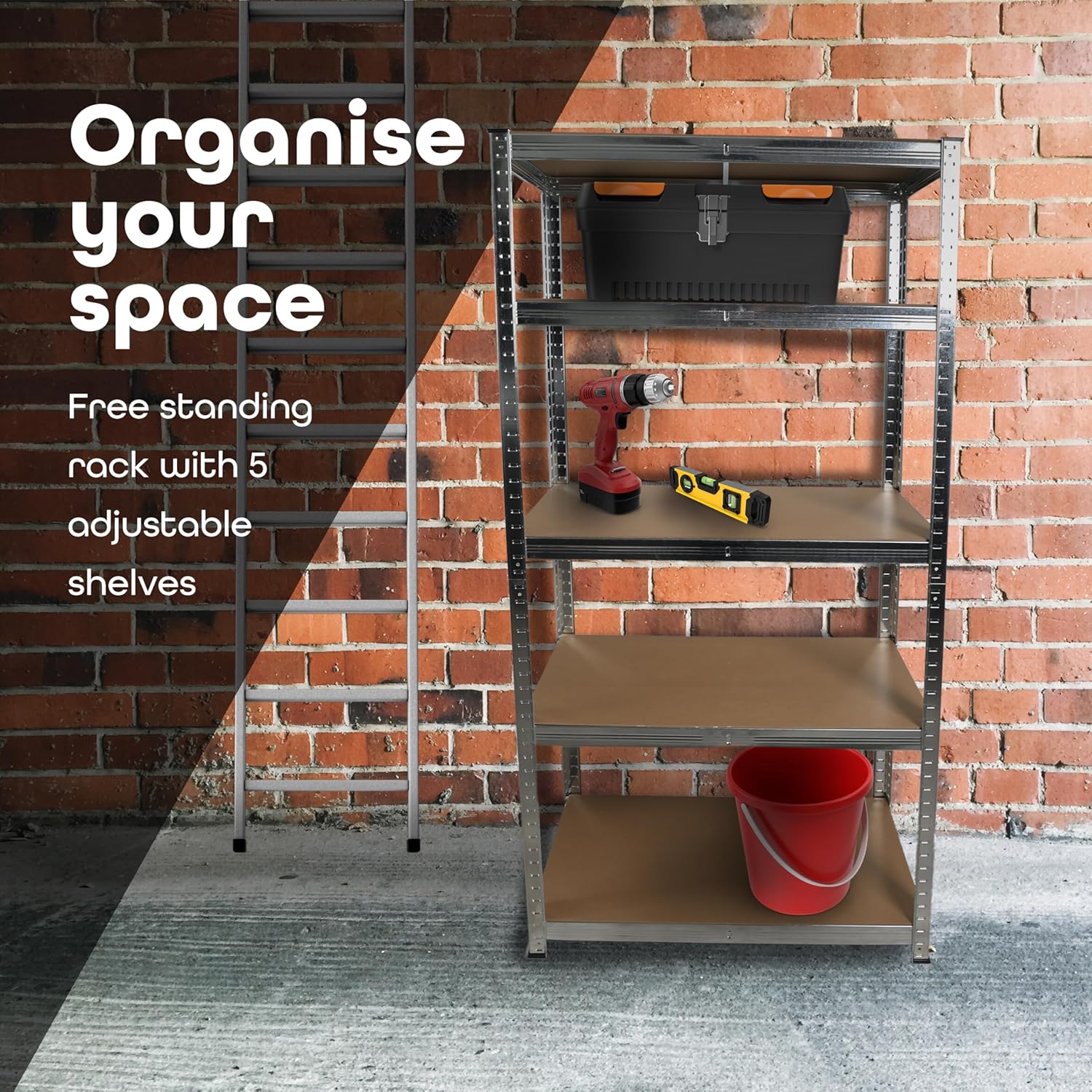 • 𝗔𝗗𝗝𝗨𝗦𝗧𝗔𝗕𝗟𝗘 𝗦𝗛𝗘𝗟𝗩𝗘𝗦 — Organise your space with a free-standing rack with 5 adjustable shelves. Customize the height of each shelf to accommodate items of various sizes. Storage shelving unit; garage storage shelves; heavy duty shelving; shelves for shed; 5 tier shelving unit; shed storage shelves.