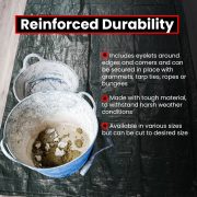 Crafted from thick, durable material with reinforced edges and rust-resistant grommets. Built-in rope at the edges enhances strength and makes for easy securing.